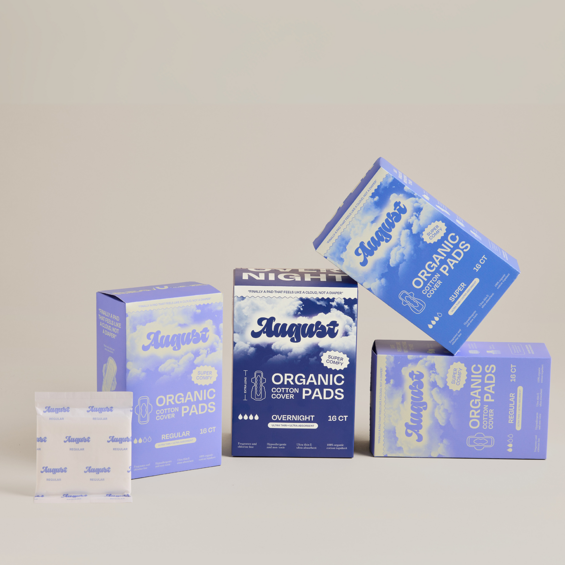 Ideal for those who prefer the security of pads, this box offers a selection of 64 pads to suit your flow. Experience why our community says our pads are the softest and find your perfect fit by trying all our pad sizes. August's Pad Starter Box is your go-to for worry-free protection during your period.